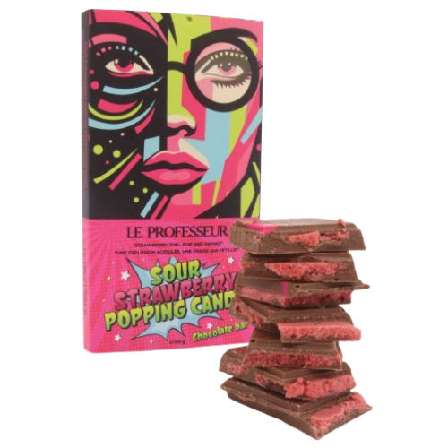 Get ready for a taste explosion with Le Professeur Sour Strawberry Popping Candy Chocolate! Each 90g bar contains the perfect balance of sour, sweet, and popping goodness. With 12 bars in each pack, there's enough for the whole gang to enjoy. Let the fun begin!