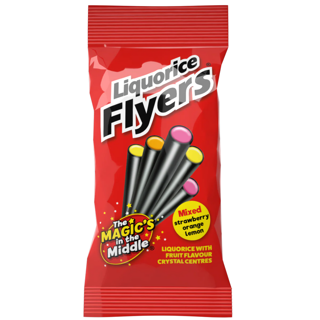 Liquorice flyers in a pre packed bag with liquorice flavour crystal centres to get stuck into! These are now longer than ever! These pre packed bags come in a wholesale box that contains 12 bags.