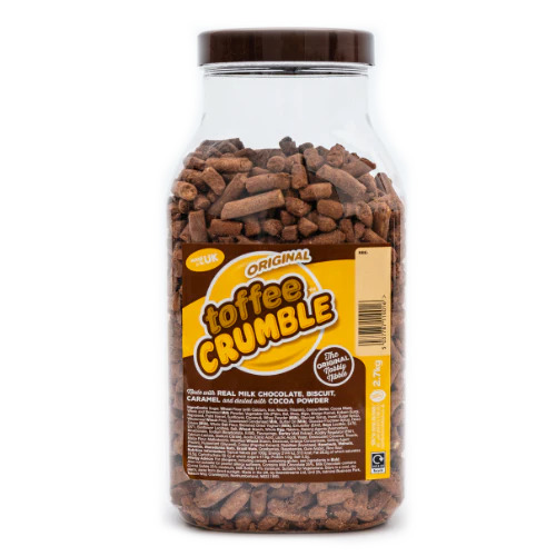 Toffee Crumble is chocolate flavoured confectionery made with real milk chocolate, caramel, biscuit and coated with cocoa powder. This is made in the UK by Sweet Dreams and comes in a wholesale display jar containing 2.7kg of toffee crumble.